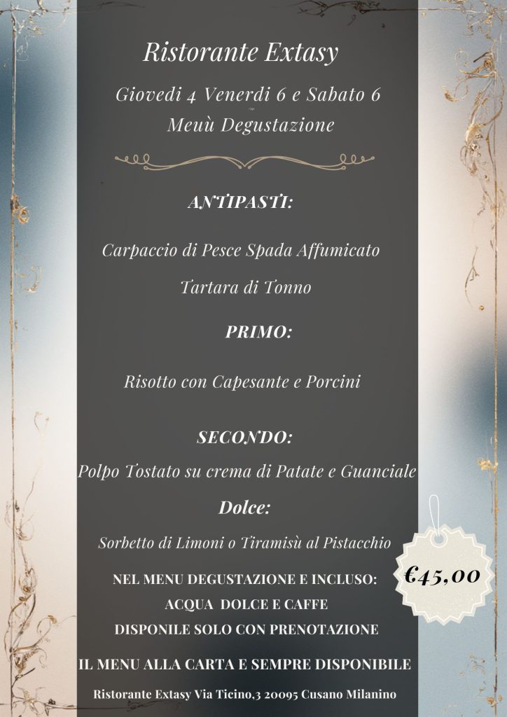 Giovedì 4 Venerdì 5 e Sabato 6 Dicembre LA NOSTRA SPECIALITA:Plateau di Cruditè,Scampi, gamberi rossi e viola Sicilia, ostriche, ricci di mare, astici,aragoste alla Catalana il accompagnati da una selezione di Bollicine Franciacorta e Champagne. Chef Gianni S.